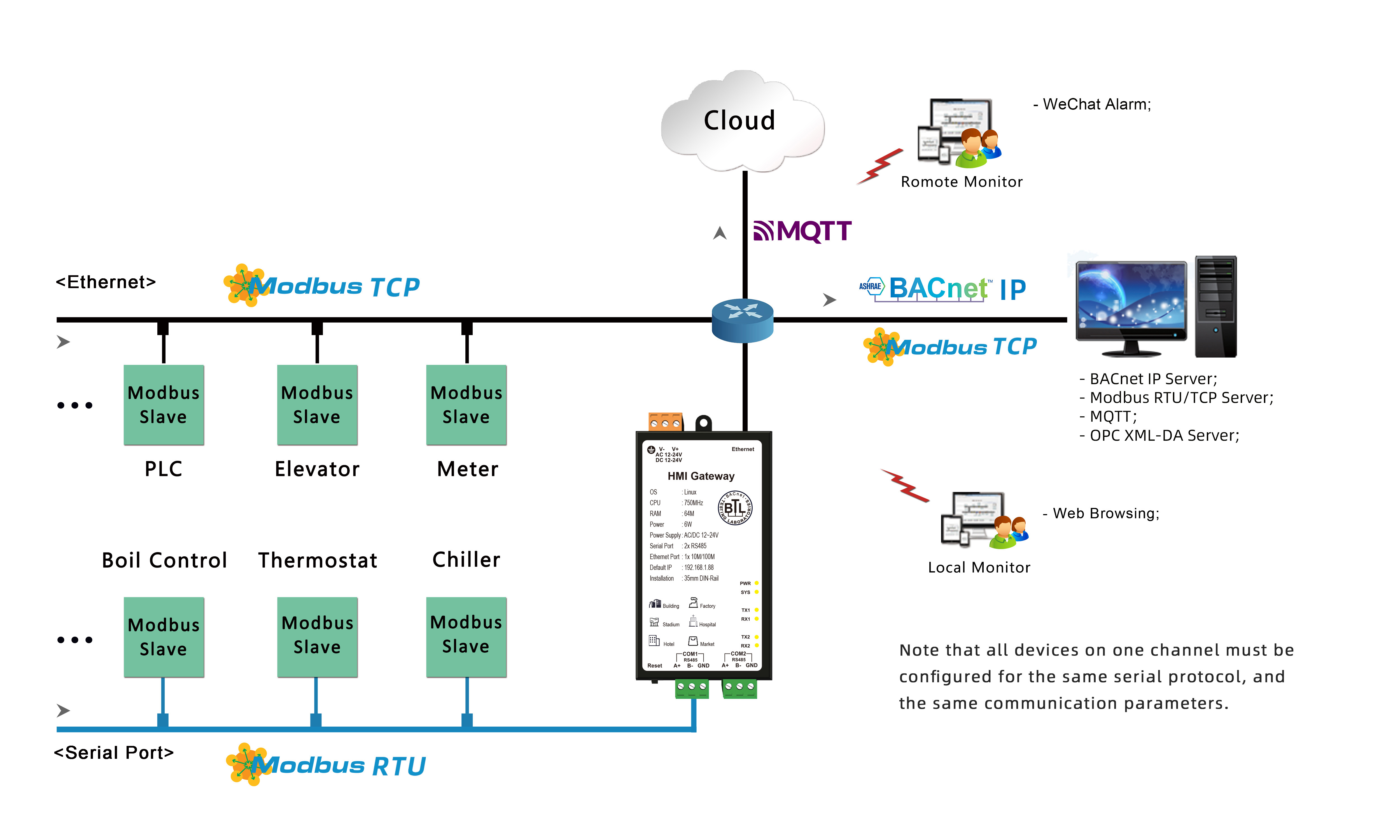 IoT gateway HMI1002-ARM (with 1x Ethernet port, 2x RS485 serial port, dynamically supporting 512 points) is capable of collecting data from Modbus RTU/TCP and more than 500 protocols, and simultaneously forwarding it to Modbus, BACnet, OPC UA, MQTT and IEC61850 server. It also features WeChat, SMS platform, DingTalk, Email, FeiShu, Telegram, Viber, and LINE Alarm, and the ability to upload engineering projects to the cloud.