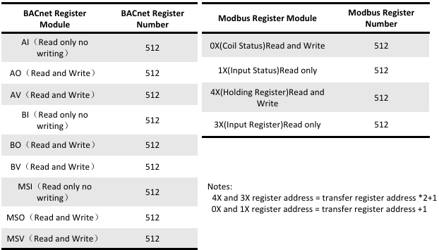 The BACnet/Modbus register types and maximum number of points supported are shown in the table below.