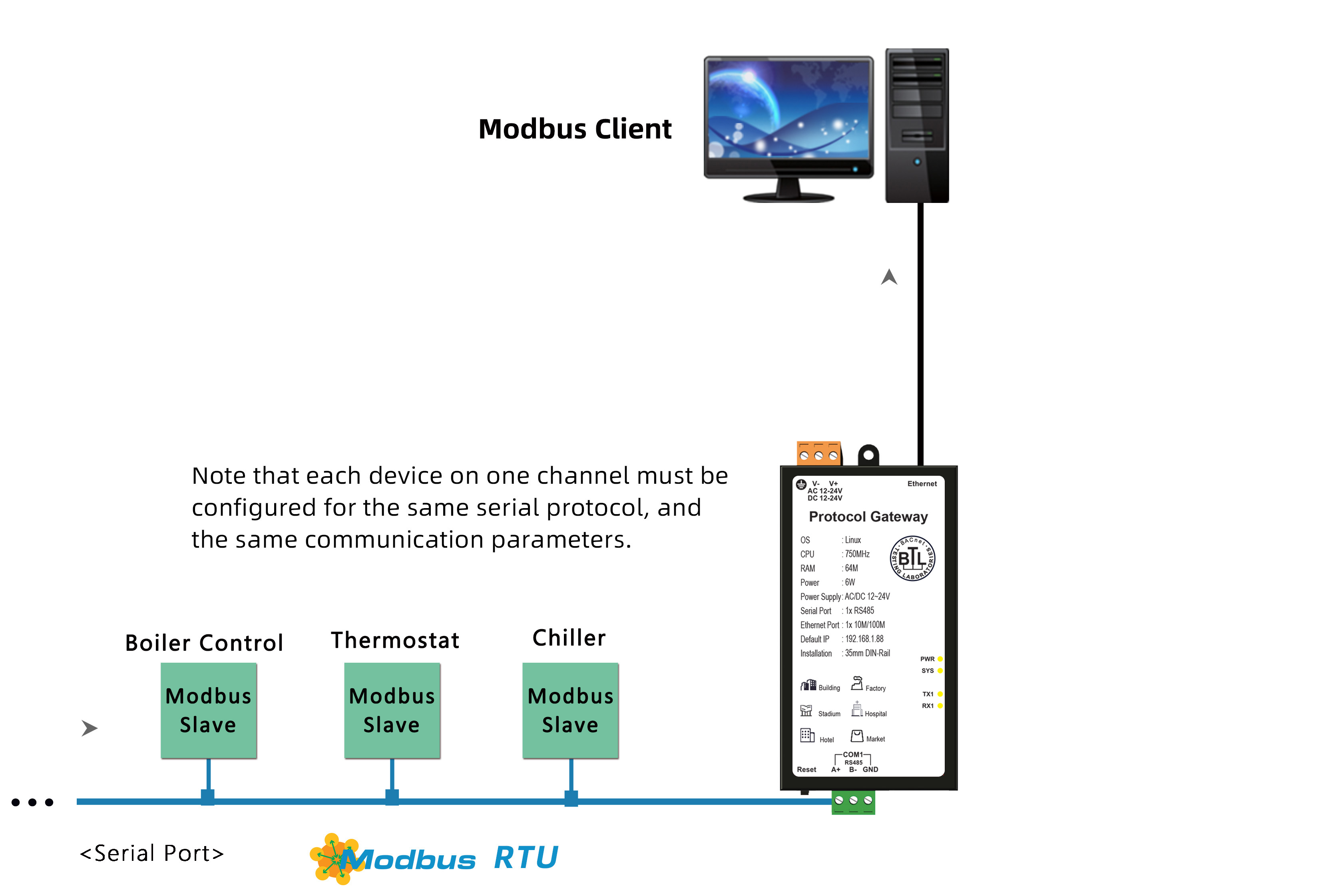 It is used to integrate Modbus RTU device, such as PLC, DDC, temperature controller, elevator, air conditioner, UPS, fire alarm system, smart lighting, electricity meter, water meter, etc., via the Modbus TCP protocol over an Ethernet port into configuration software like Citect, IFIX, RSVIEW, WinCC, Kingview, ForceControl, and others.