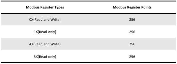 The Modbus gateway supports Modbus RTU/TCP servers. The supported register types and maximum number of points for the server are listed in the table below. Note: The number of gateway registers is dynamically supported, with each type of register capable of supporting up to the total number of points supported by the gateway.