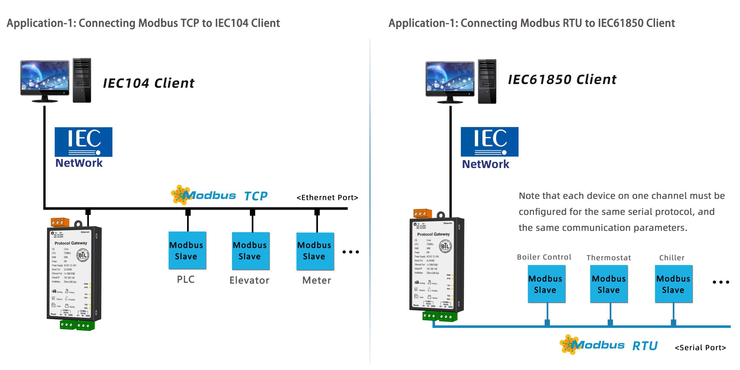 Hardware gateway supports multiple protocol conversion, can solve PLC, air conditioning, elevator, fire control, lighting control system, electric meter, water meter of different products, through the hardware gateway will be Modbus, BACnet and other various different protocols into IEC104 protocol or IEC61850 protocol, so that the IEC client configuration software can access the site through the X2IEC gateway equipment, implementation data acquisition, data monitoring, and remote reading scene temperature, and alarm status data.