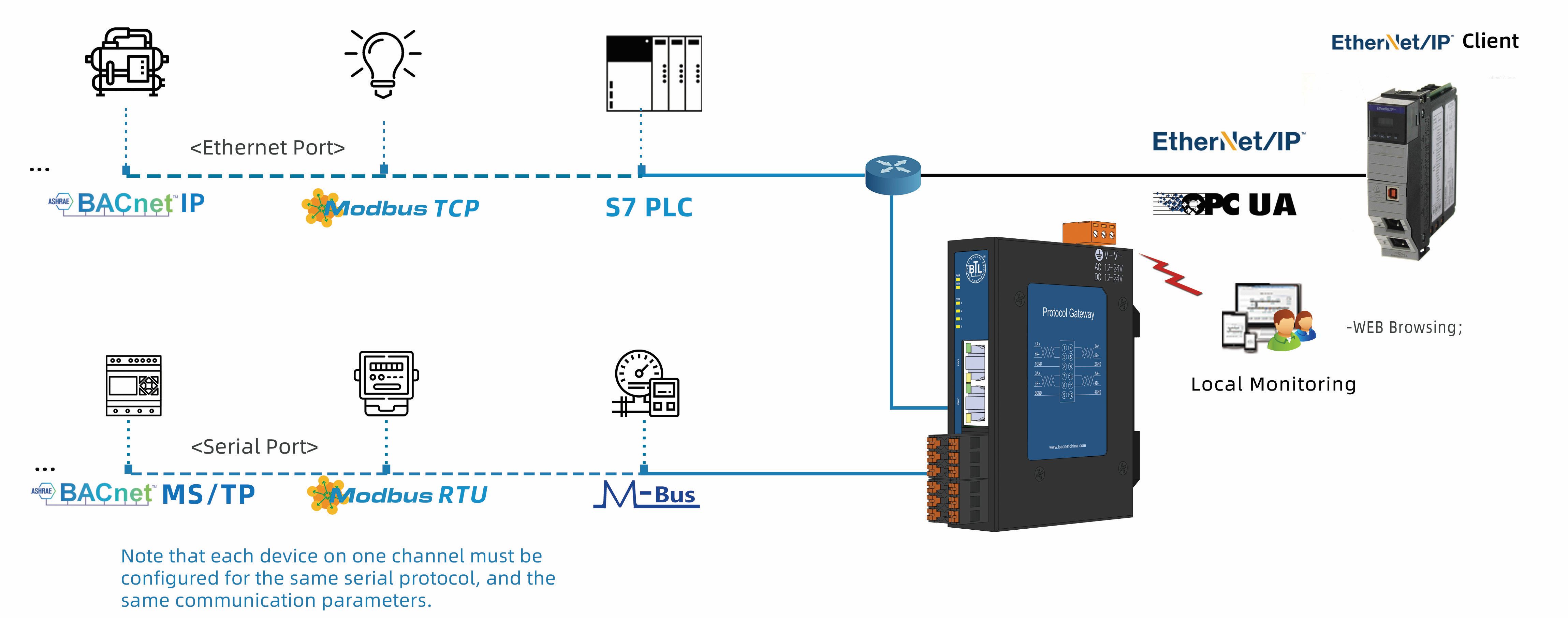 EtherNet/IP Gateway EIP2004-ARM (featuring 2 Ethernet port and 4 RS485 serial port, dynamically supporting 1024 points) supports the collection of more than 500 protocols, such as Modbus, BACnet, OPC, and various PLC protocols, converting them into a standard EtherNet/IP server. EtherNet/IP is a common industrial Ethernet protocol, with "IP" in its name standing for "Industrial Protocol".