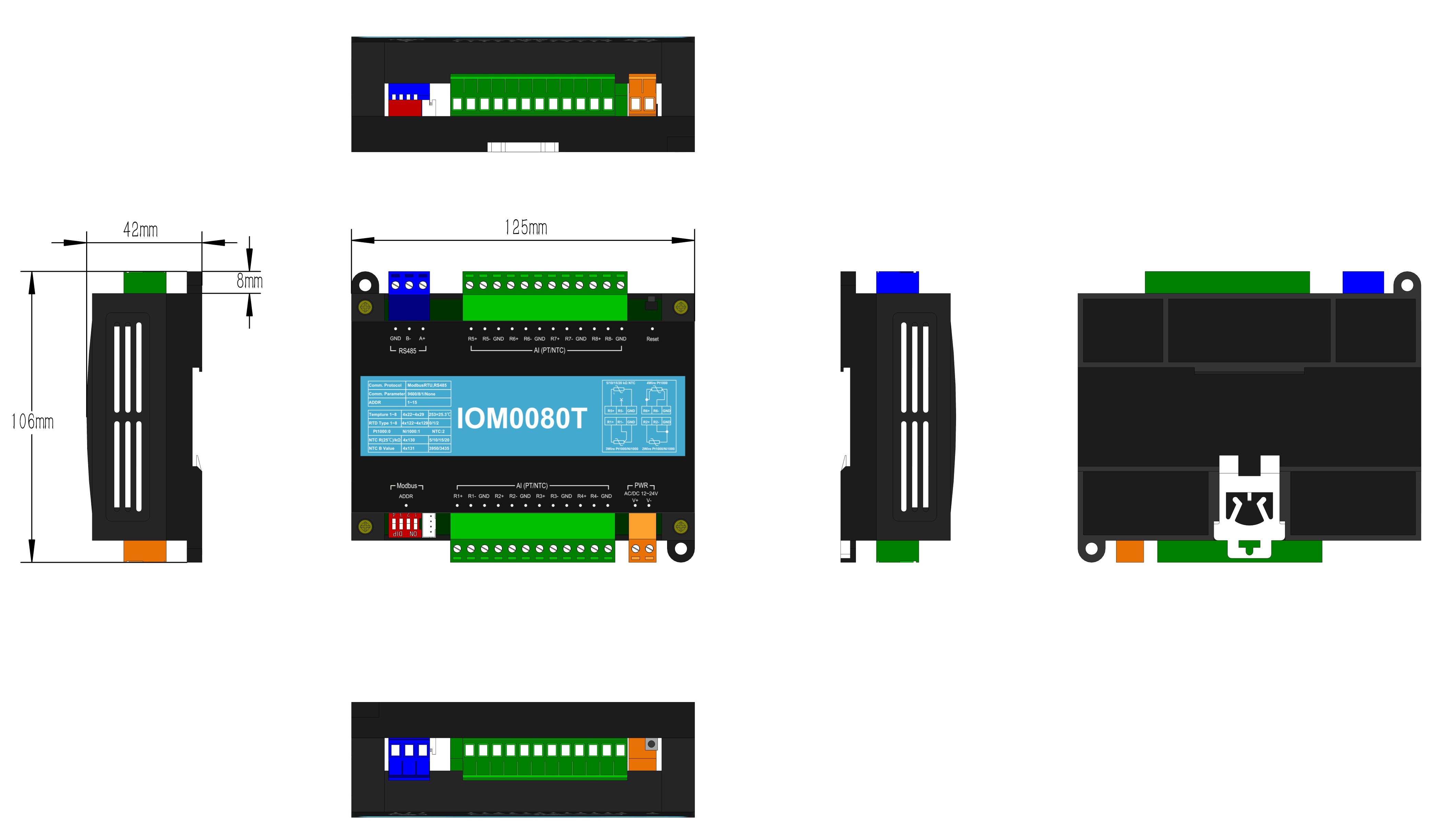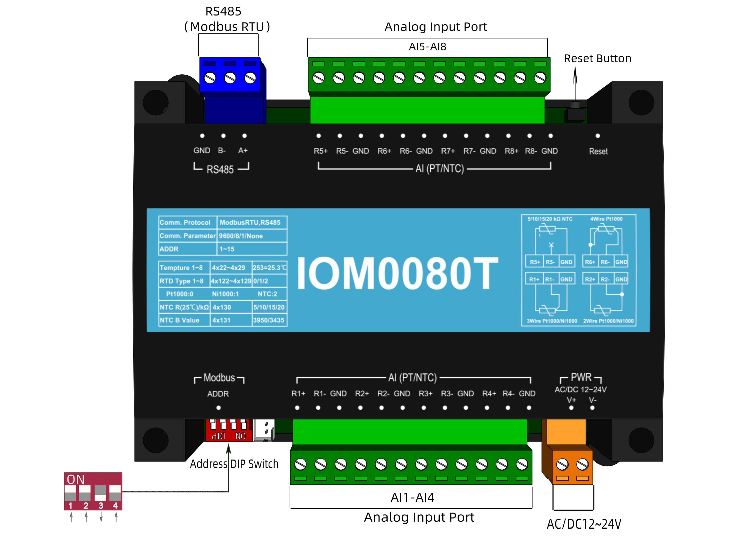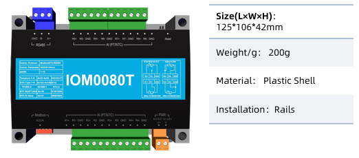 Supports Modbus RTU protocol for fast network connection with controllers that support the protocol and rapid I/O port expansion. Please refer to the instruction of Modbus RTU test tool for details. RTD type of thermal resistance: Pt1000,Ni1000,NTC,Pt100,Cu100,Cu50。