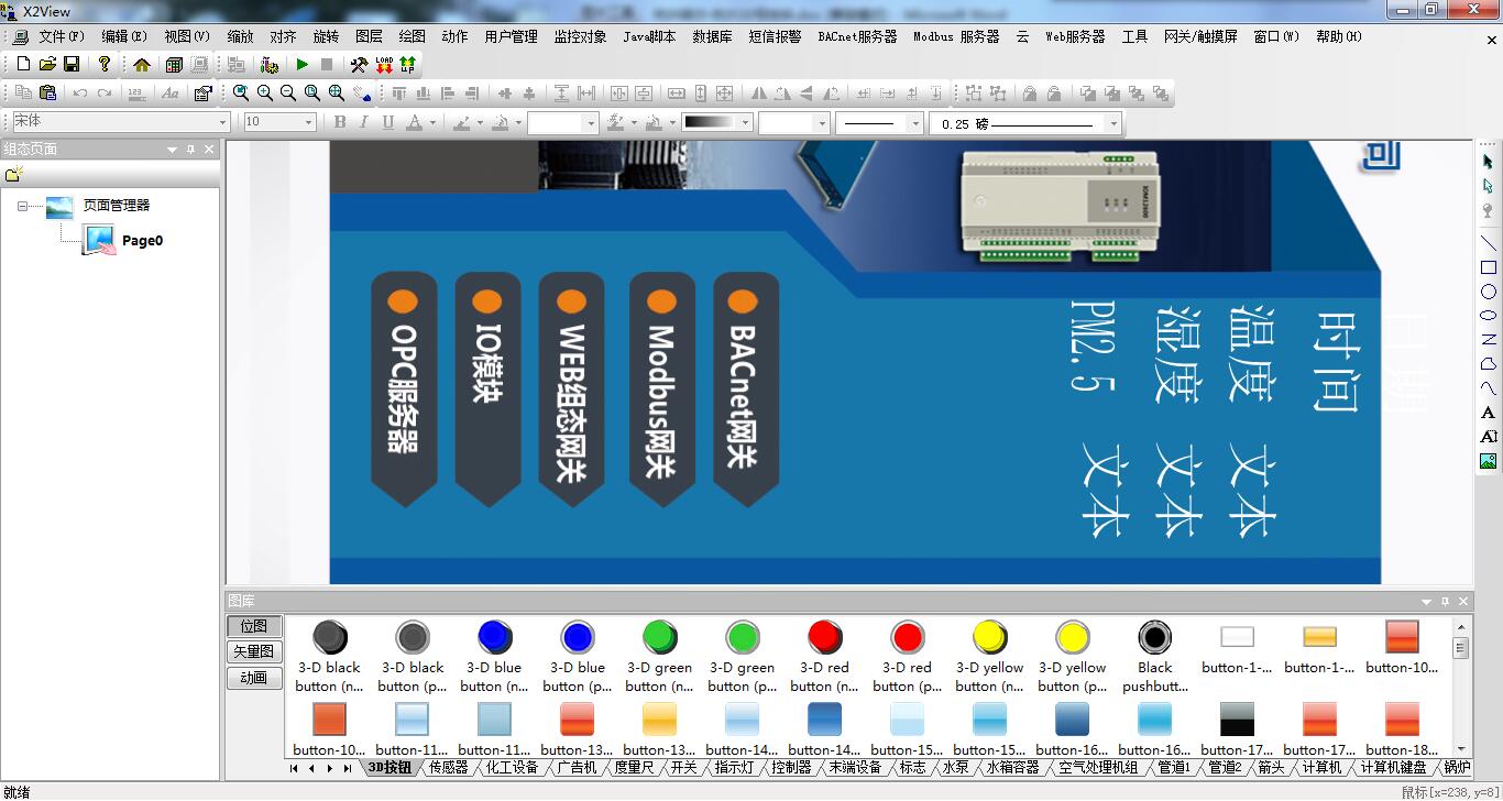 说明:温湿度传感器是Modbus RTU通讯协议,所以通过组态编辑软件X2View建立Modbus RTU驱动,并添加通道和设备。最后添加标签,采集传感器相关数据(如CO2浓度、温度、湿度、PM2.5等)。
