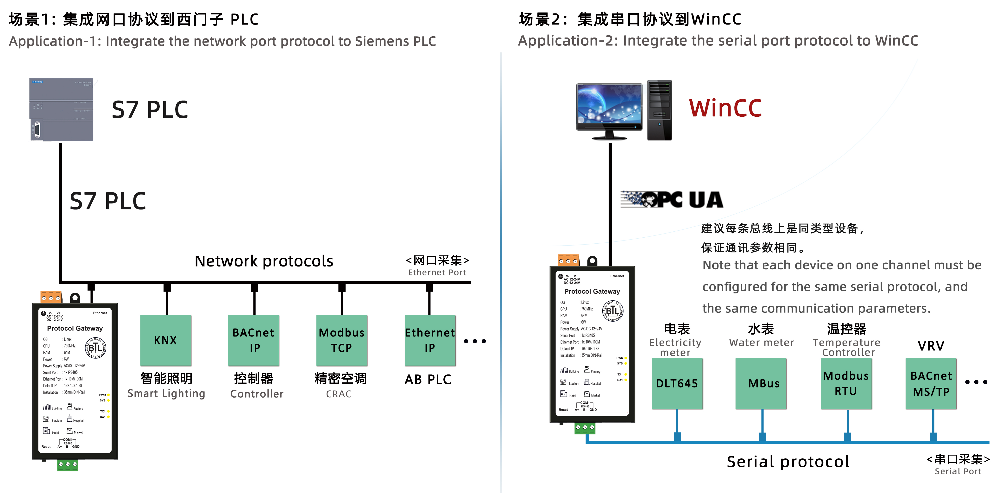 S7 PLC网关相当于一座通信桥梁,将其它非标准通讯协议转成标准西门子PLC S7协议 ,使WinCC上位机、西门子Smart200\1200\1500\300\400等PLC通过硬件网关和不同设备互相通讯,方便系统集成。