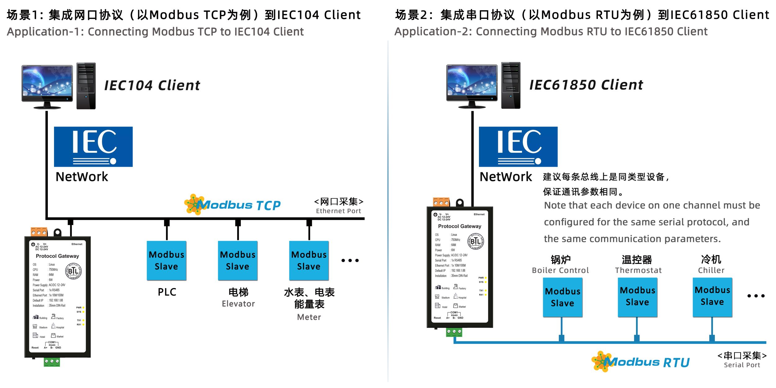 解决PLC、空调、电梯、消防、灯光控制系统、电表、水表不同产品,通过硬件网关将Modbus,BACnet等等其他各家不同的协议转换成IEC104规约或IEC61850规约,这样IEC客户端组态软件就可以通过X2IEC网关访问现场设备了,实现数据采集、数据监控、以及远程读取现场温度、报警状态等各种数据。