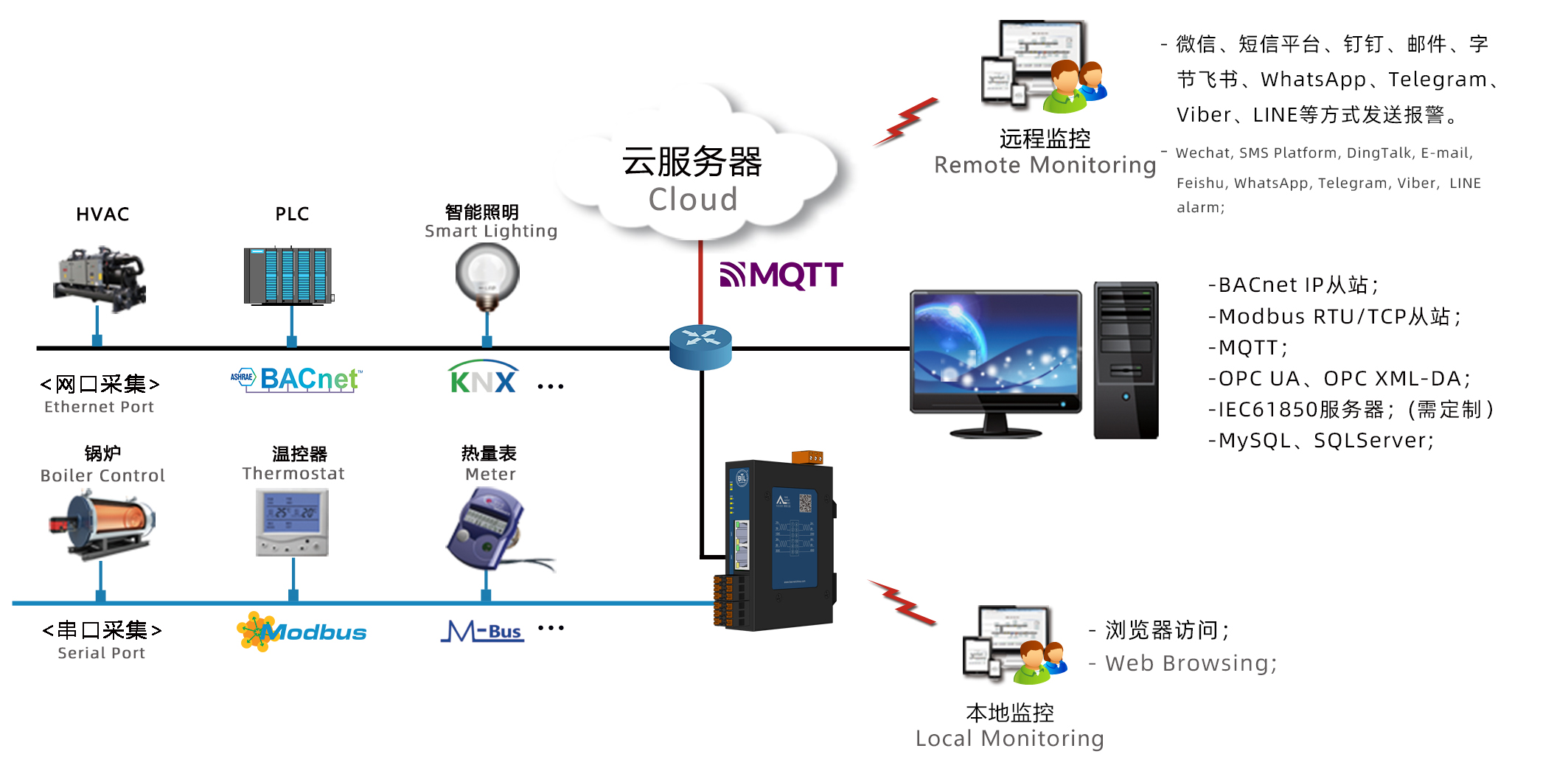 应用在楼宇自控系统,或者工业领域连接一些常见的控制设备,如PLC、DDC、UPS、中央空调、电梯、消防、灯光控制系统、电表、水表等。这样用户就可以通过WEB组态触摸屏,或者手机、iPad、PC监控现场设备。